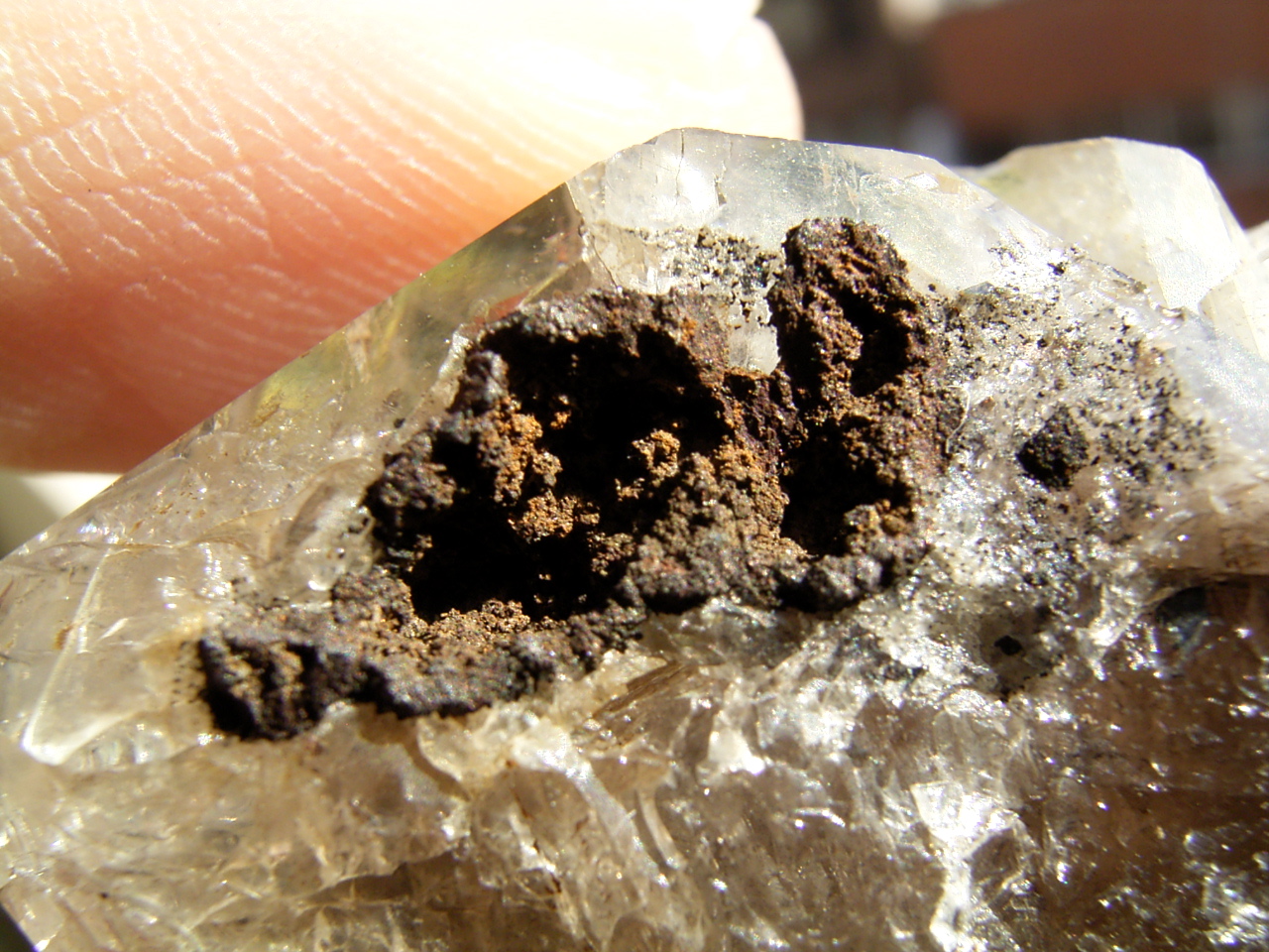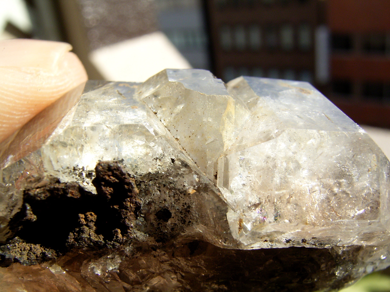 結晶ウラに、鉄サビ色の母岩痕と美干渉はがれ痕跡があります。