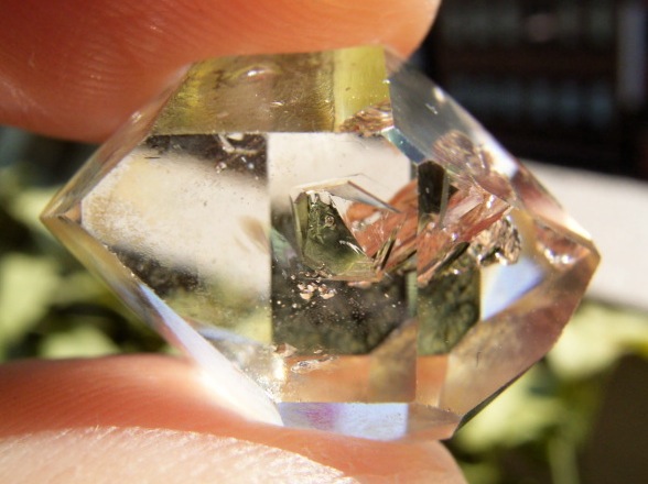 ■ 目立つのは、ファセット面下の、立体三角気泡と鏡面幕・虹幕に微細負晶銀河。画像の通りです。