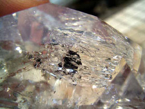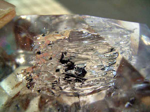 ◆撮影時には気付きませんでしたが、結晶横の柱面のエッジ寄りにも、大きな水入りがありました。(こんなに大きな気泡なのに、目玉に気を取られていました)