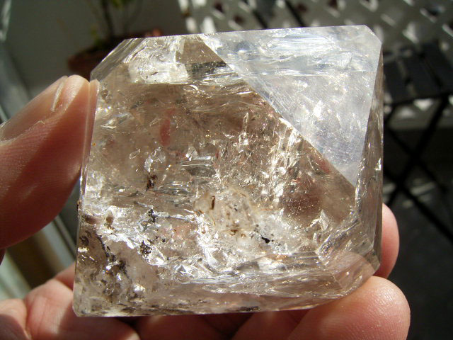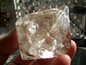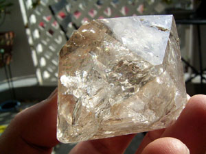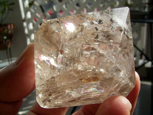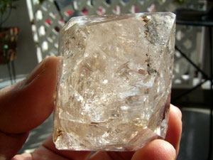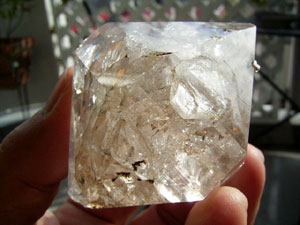クラックや気泡が一杯で、一見白く見えますが、透明部分が大きいので、結晶の深い部分まで見通せます。