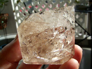 柱面のエッジに、8mmほどの透明結晶を貫入しています。