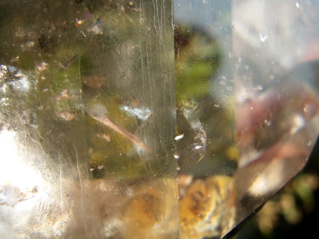 対角のとがった方のファセット面から、先端寄りの表面下に、大きな虹ヴェールが2つ。