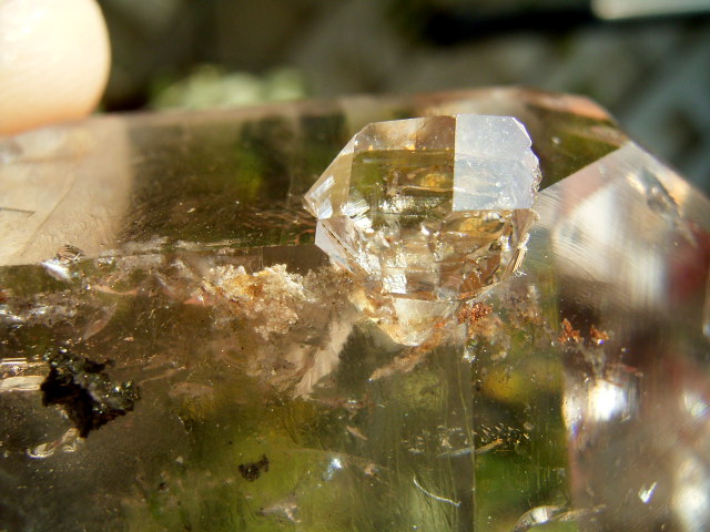 柱面とファセット面の交わるエッジに、8mm弱のクリア結晶が貫入クラスターオン。