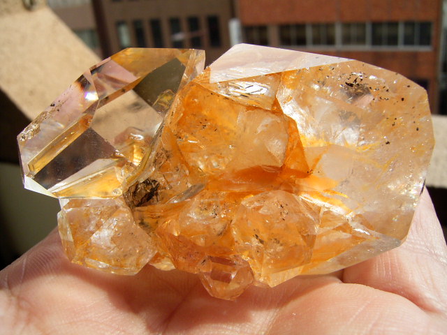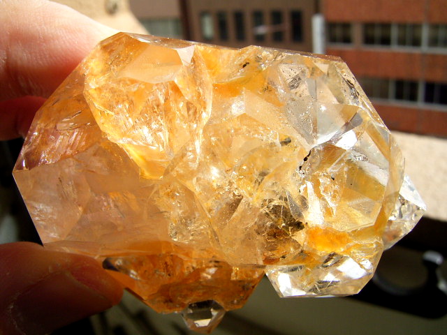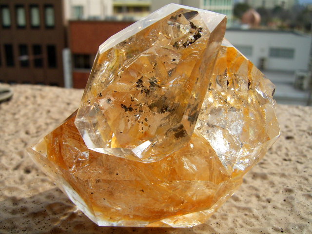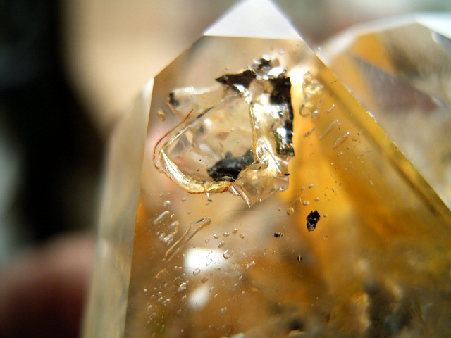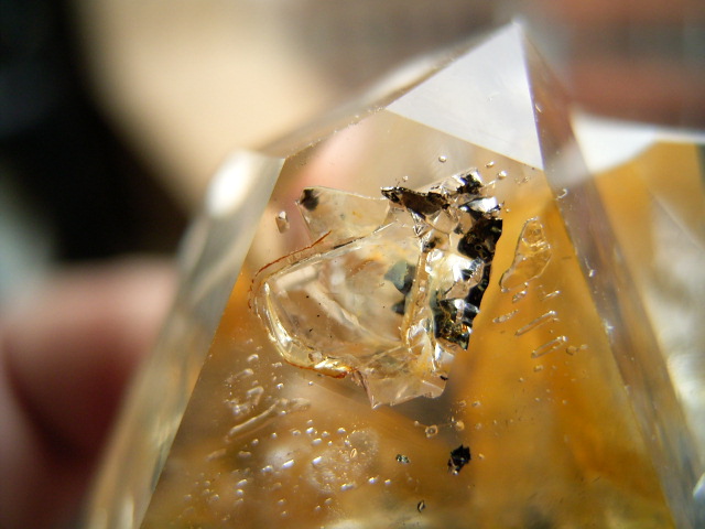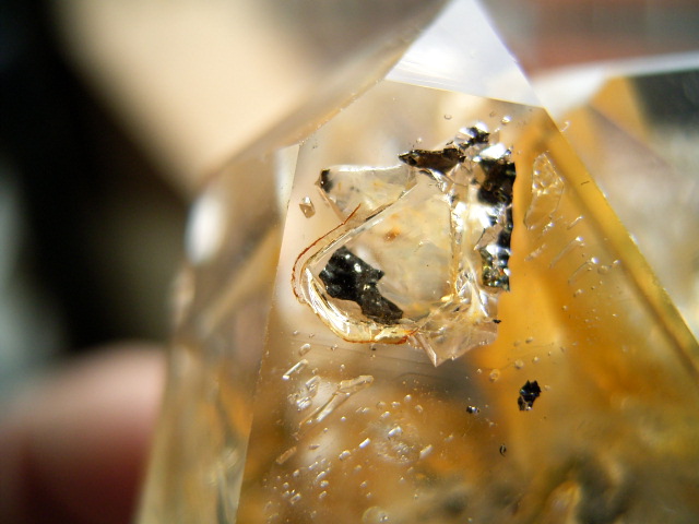 結晶名賀ほどの長さ30mm結晶の背中に、超クリア結晶が2つ。