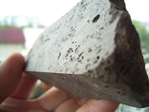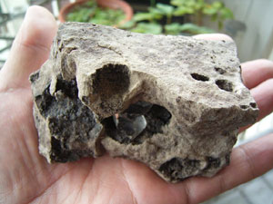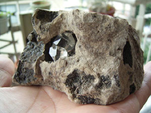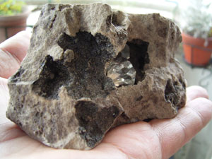 母岩の凹みには、微細なカーボン粒がタール化して付着しています。
