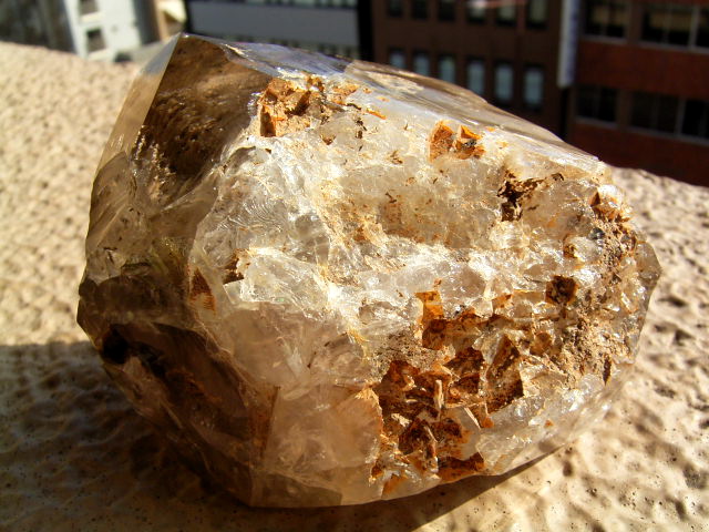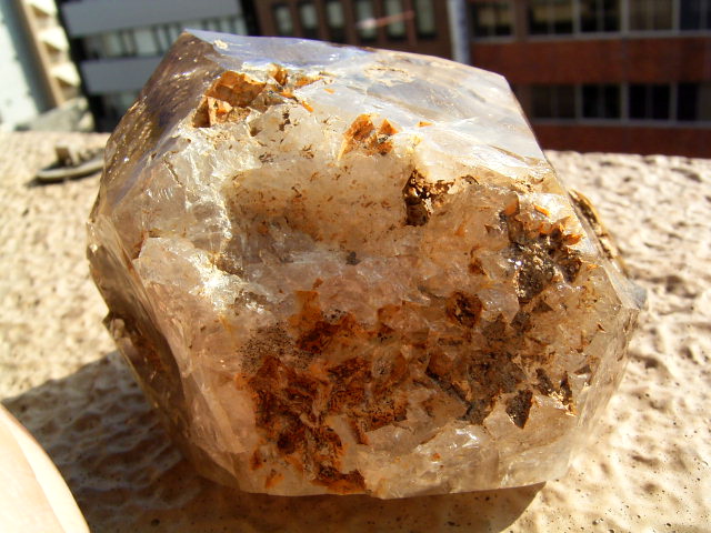 表面が茶色や黄色っぽく見えるのは、大昔の、エレスチャルの形成初期から気泡や窓に入り込んだ、現地ハーキマーの泥です。