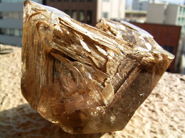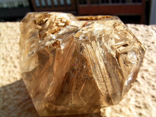 結晶を染める黄金幻影に、「大エレスチャル」、細かく観察すると、エレスチャルの重なる気泡・小さな鏡面と虹のヴェール。