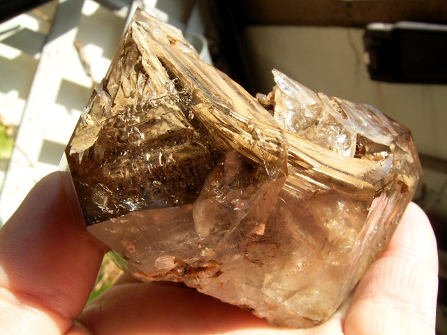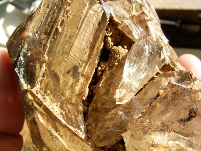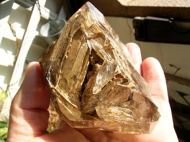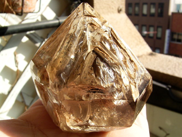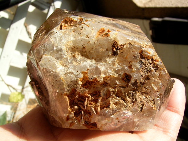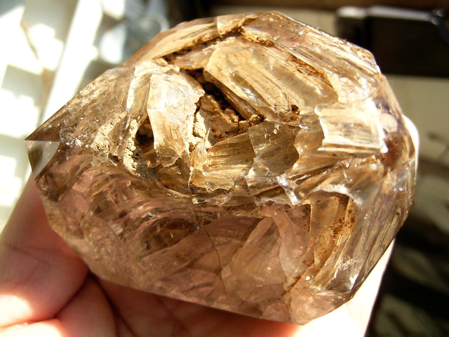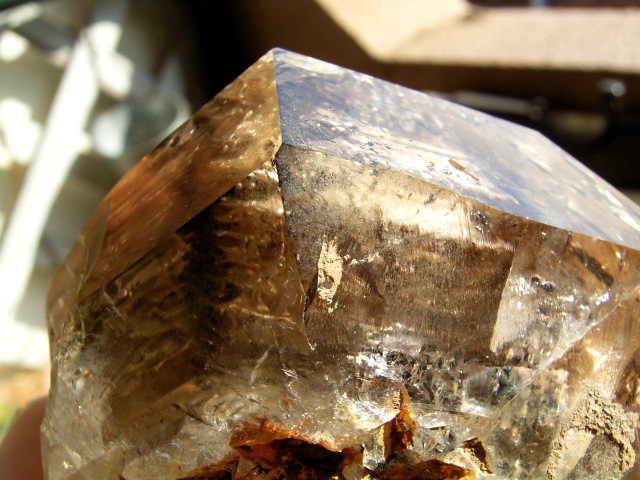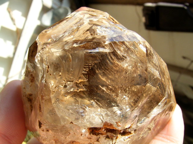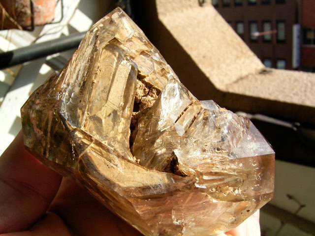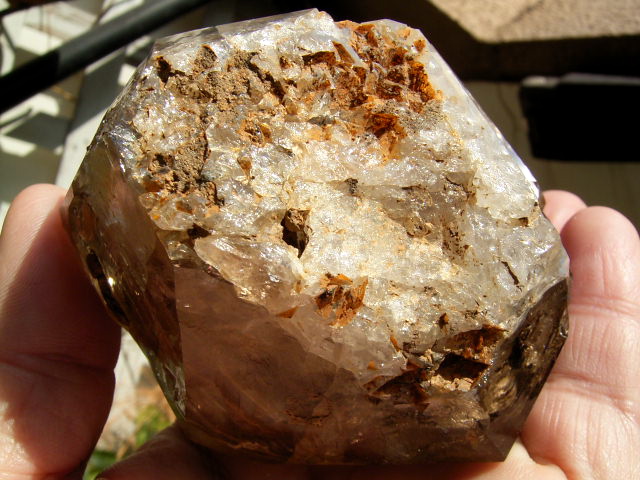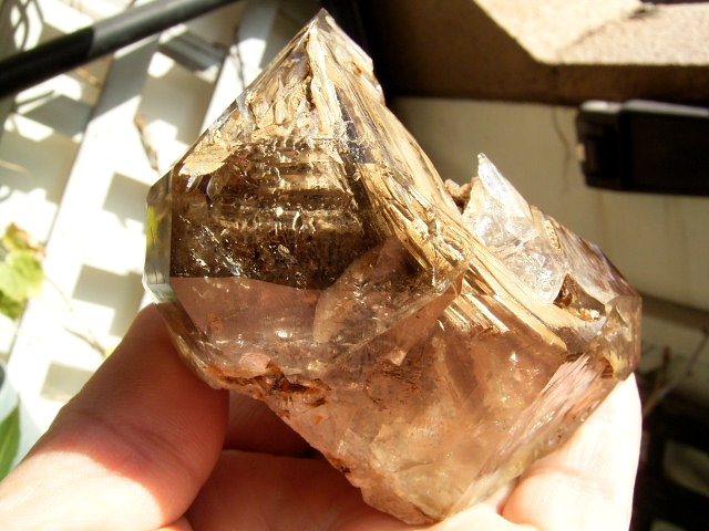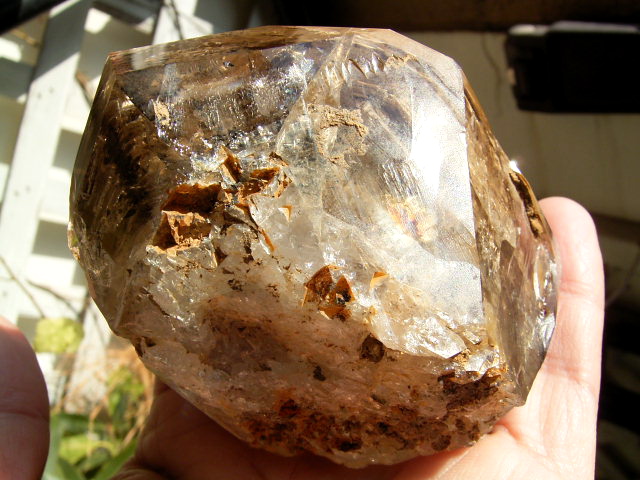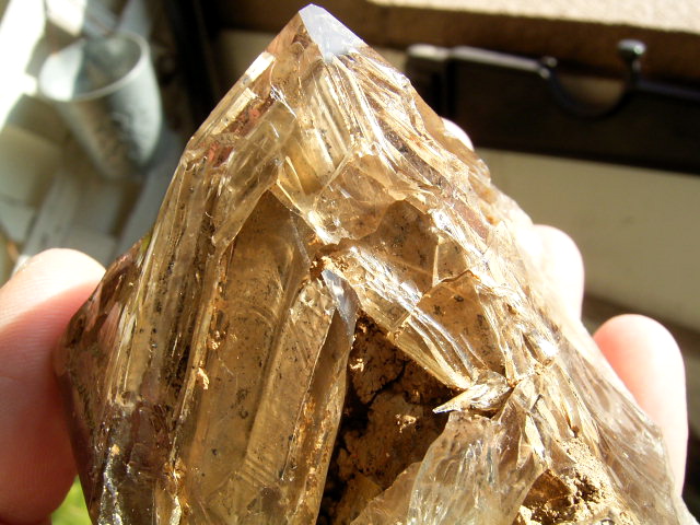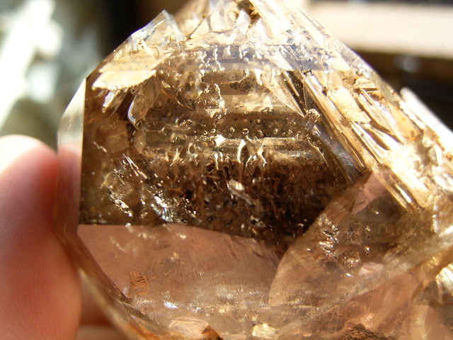 表面が茶色や黄色っぽく見えるのは、大昔の、エレスチャルの形成初期から気泡や窓に入り込んだ、現地ハーキマーの泥です。