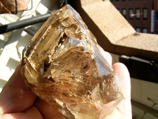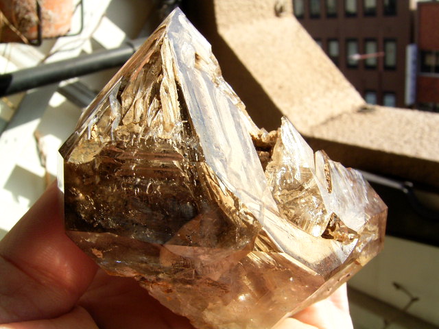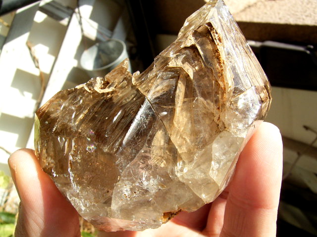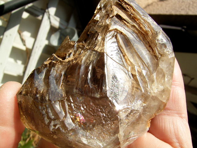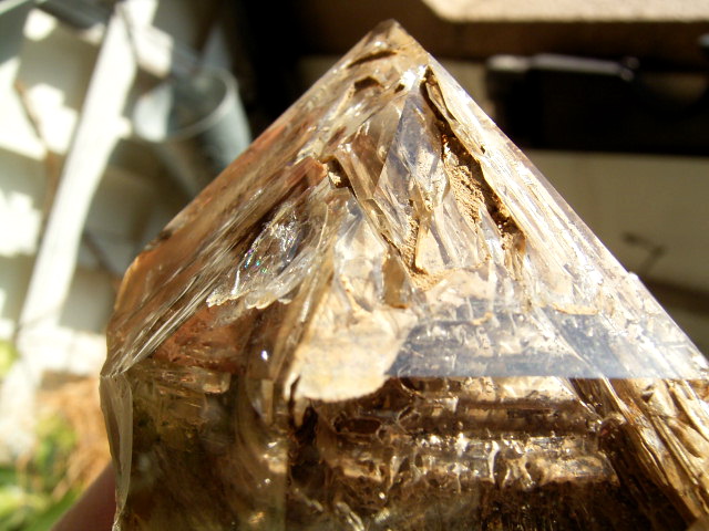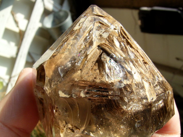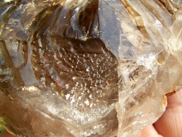 結晶を染める黄金幻影に、「大エレスチャル」、細かく観察すると、エレスチャルの重なる気泡・小さな鏡面と虹のヴェール。