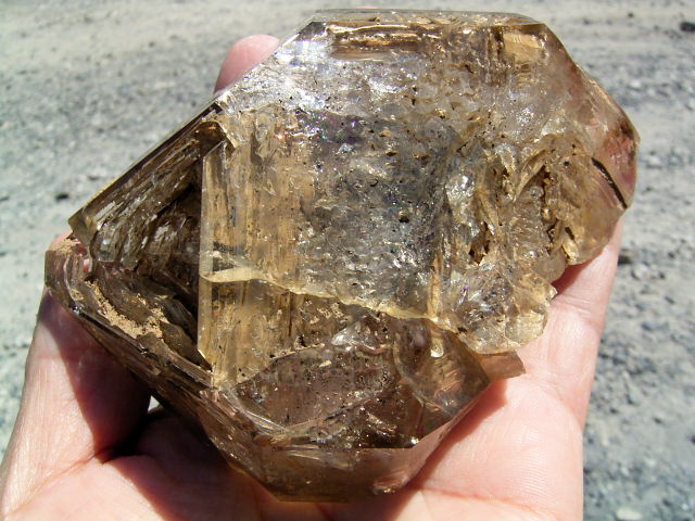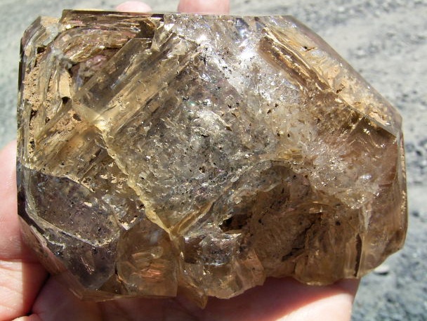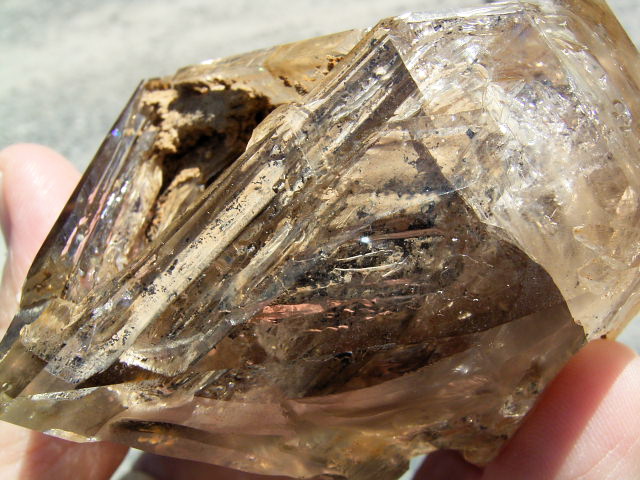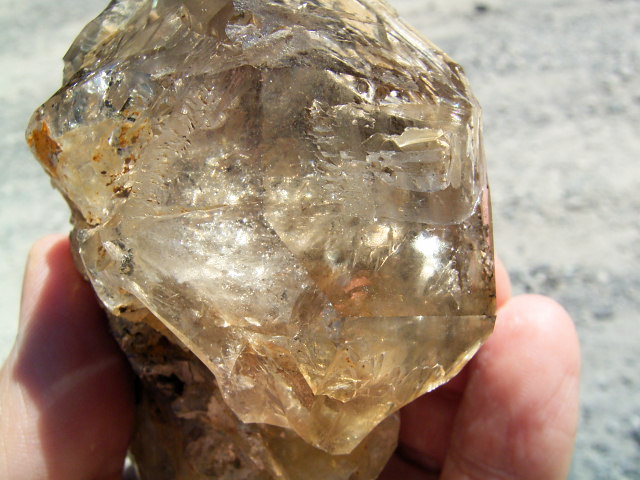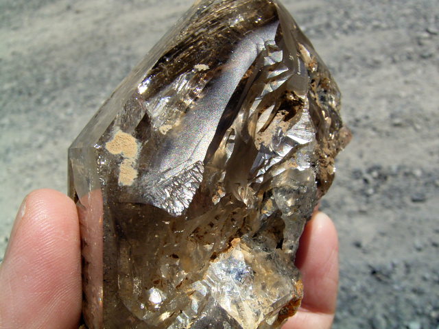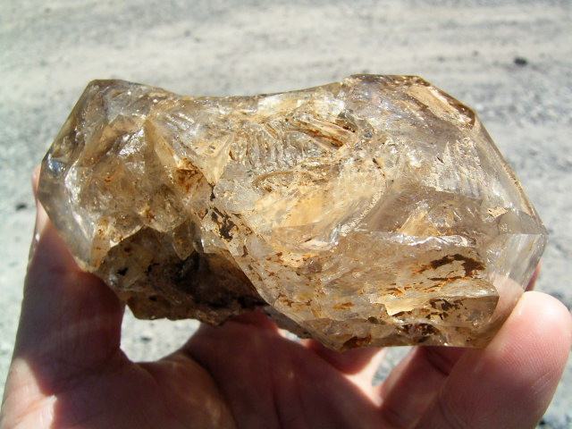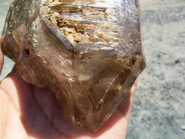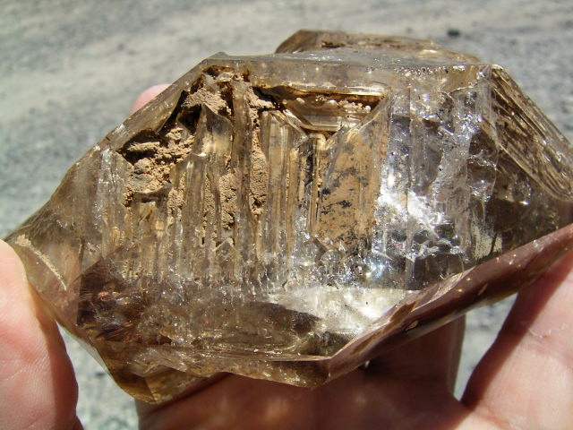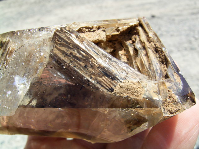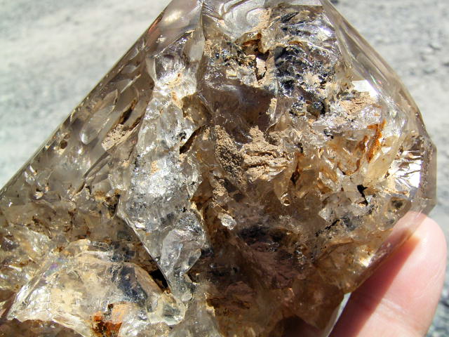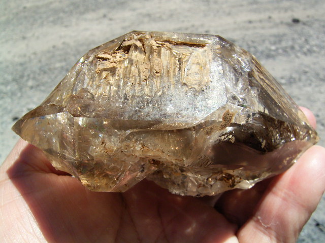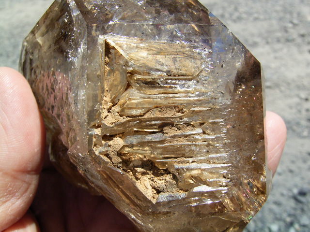 表面が茶色や黄色っぽく見えるのは、大昔の、エレスチャルの形成初期から気泡や窓に入り込んだ、現地ハーキマーの泥です。