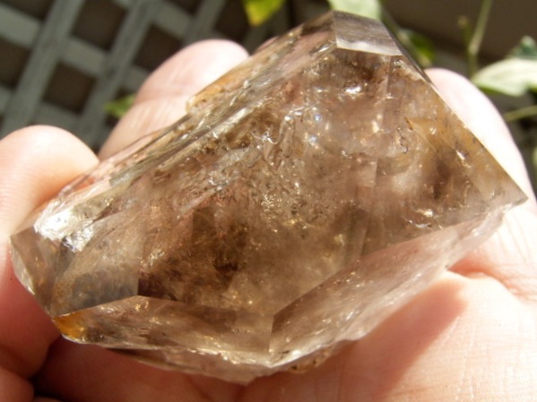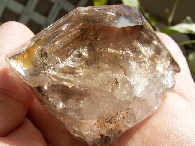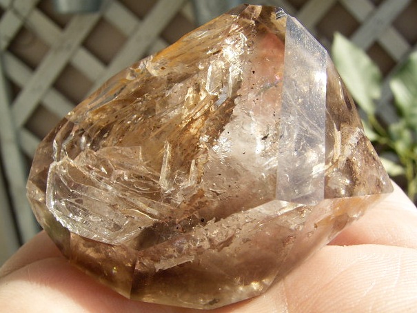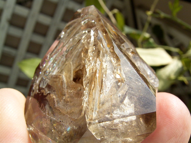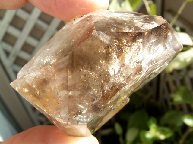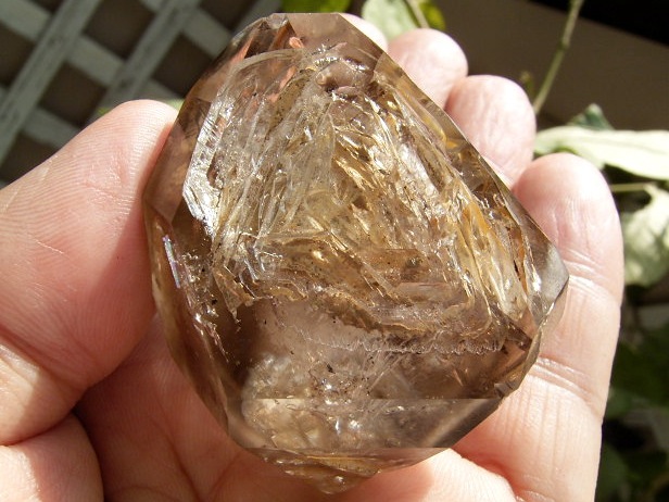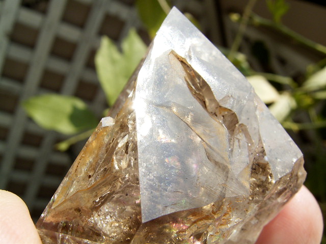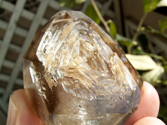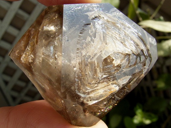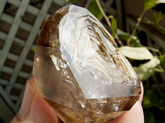 すべてが極上、太陽光の下で結晶をゴールドに染める「濃煙幻影」と大きな「エレスチャル」の重なる気泡。