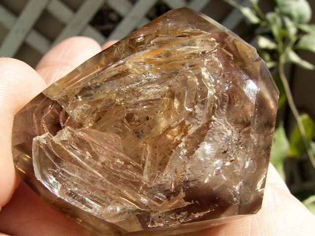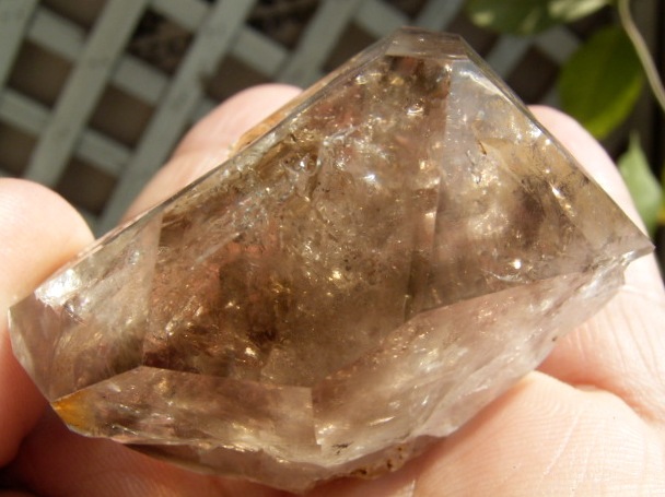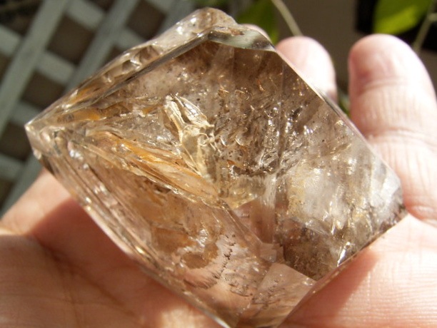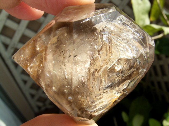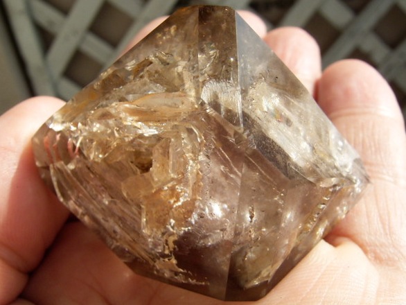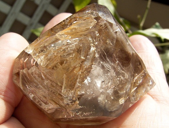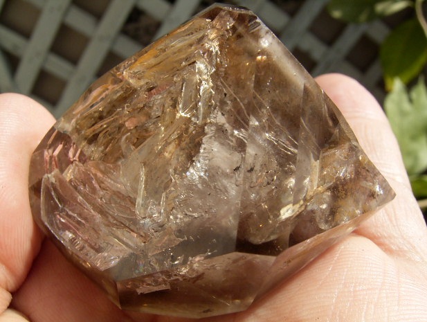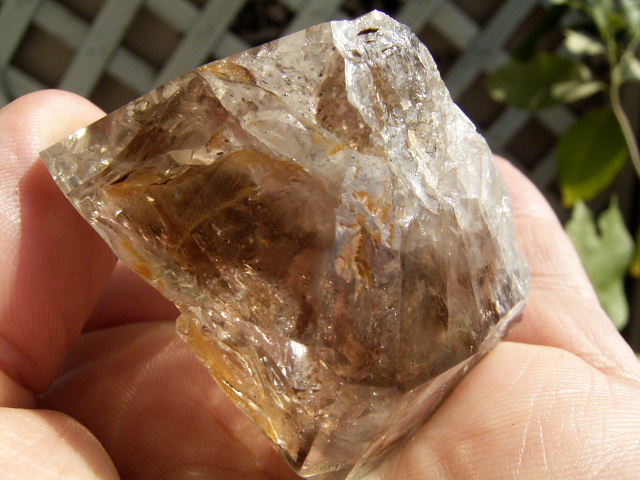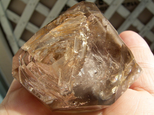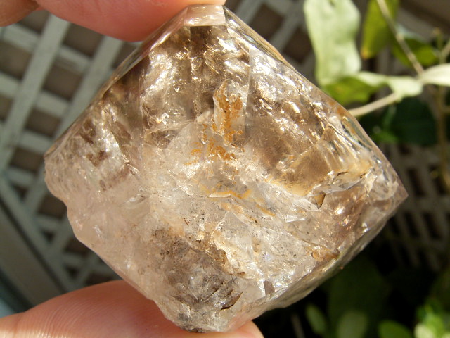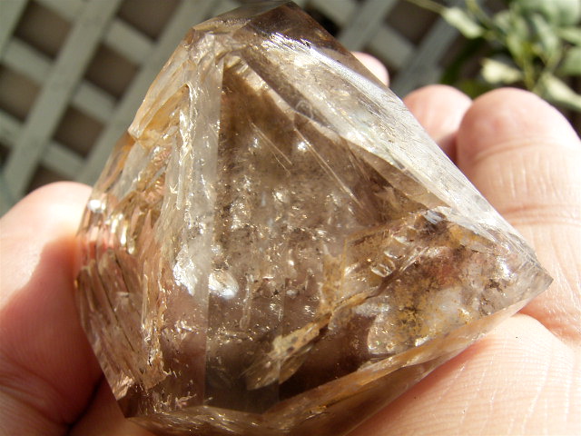 すべてが極上、太陽光の下で結晶をゴールドに染める「濃煙幻影」と大きな「エレスチャル」の重なる気泡。
